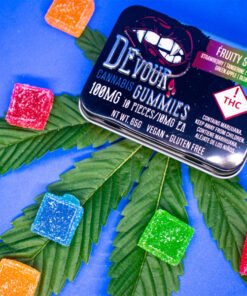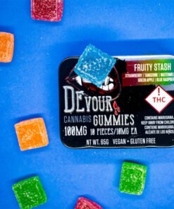 Devour Gummies has been blazing the Colorado market since 2016 and was named “Gummy” of the year by Leaflink in 2018. Our sugar-covered Fruity Stash Gummies are made from scratch with a pectin base so you can enjoy a vegan and gluten-free treat. With Fruity Stash, you get a little bit of all our top-selling 5 flavors: Blue Raspberry, Green Apple, Strawberry, Tangerine, and Watermelon. 100mg THC infused into each package, leaving each gummy at 10mg THC!